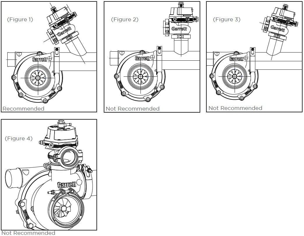 La connessione ideale è a 45° con una transizione graduale (Figura 1). Posizionare la wastegate a 90° rispetto al collettore (Figura 2) ridurrà la capacità di flusso fino al 50 percento e può causare un over boost! Una maggiore riduzione della capacità di flusso risulterà se la wastegate è posizionata ad angoli maggiori di 90° (Figura 3). Le Figure 2 e 3 riducono notevolmente il controllo che si ha sul sistema e possono mettere a rischio l’intera catena cinematica. Non montare mai la wastegate sull’alloggiamento della turbina, ciò ridurrà le prestazioni del turbocompressore (Figura 4). Contattare un distributore autorizzato per ulteriori informazioni.