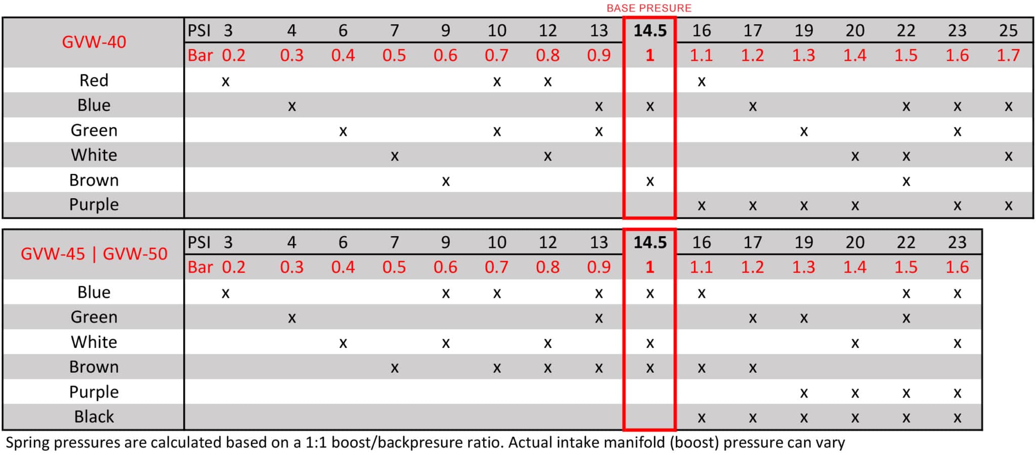 Le wastegate GVW sono impostate su 1 Bar di pressione di base e possono essere configurate a 0,2 Bar / 1,7 Bar (considerando 1:1 contropressione).